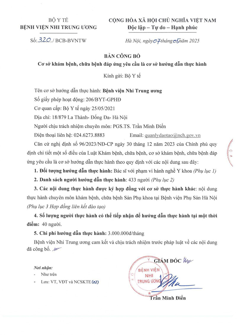 IV. Thời gian đào tạo: Học tập trung 03 tháng liên tục tại Bệnh viện Nhi Trung ương.