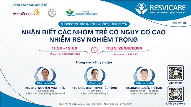 Viện Đào tạo và Nghiên cứu Sức khỏe Trẻ em – Bệnh viện Nhi Trung ương xin trân trọng thông báo và kính mời các cán bộ, nhân viên y tế tham dự Chương trình đào tạo y khoa liên tục trực tuyến: Nhận biết các nhóm trẻ có nguy cơ cao nhiễm RSV nghiêm trọng.
