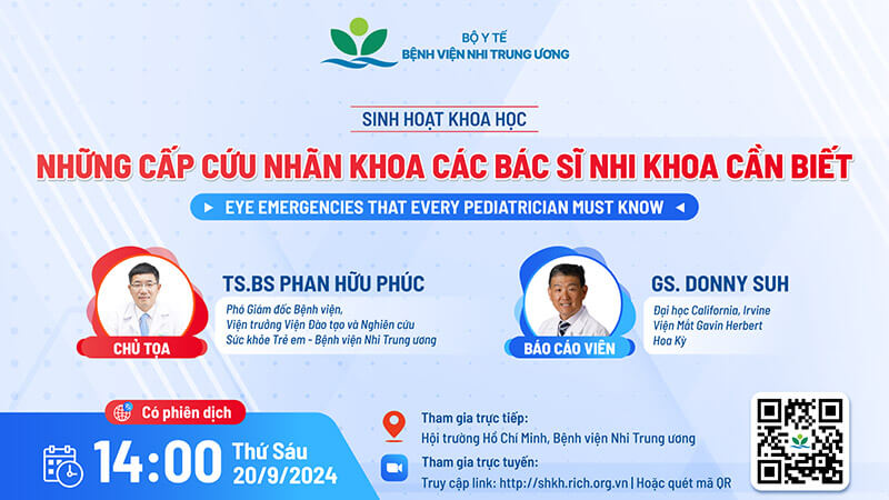 Viện Đào tạo và Nghiên cứu Sức khỏe Trẻ em – Bệnh viện Nhi Trung ương xin trân trọng thông báo và kính mời các cán bộ, nhân viên y tế tham dự buổi Sinh hoạt khoa học với chủ đề: Những cấp cứu nhãn khoa các bác sĩ Nhi khoa cần biết