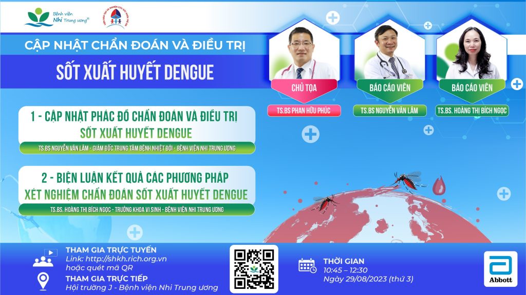 Viện Đào tạo và Nghiên cứu Sức khỏe Trẻ em, Bệnh viện Nhi Trung ương xin trân trọng thông báo và kính mời các cán bộ, nhân viên y tế tham dự buổi giảng cập nhật kiến thức y khoa với chủ đề: Cập nhật chẩn đoán và điều trị Sốt xuất huyết Dengue