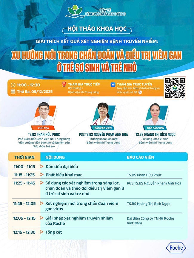 Viện Đào tạo và Nghiên cứu Sức khỏe Trẻ em – Bệnh viện Nhi Trung ương xin trân trọng thông báo và kính mời các cán bộ, nhân viên y tế tham dự Hội thảo khoa học: Giải thích kết quả xét nghiệm bệnh truyền nhiễm: Xu hướng mới trong chẩn đoán và điều trị viêm gan ở trẻ sơ sinh và trẻ nhỏ.