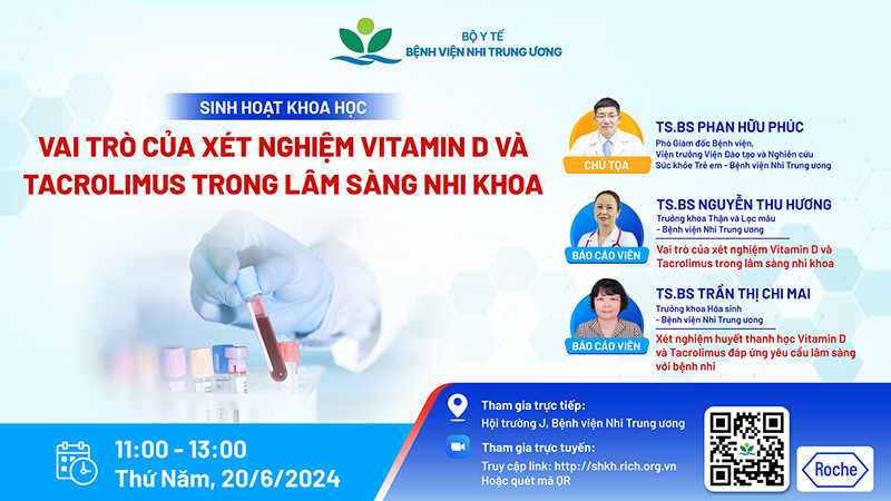 Viện Đào tạo và Nghiên cứu Sức khỏe Trẻ em – Bệnh viện Nhi Trung ương xin trân trọng thông báo và kính mời các cán bộ, nhân viên y tế tham dự buổi sinh hoạt khoa học với chủ đề: VAI TRÒ CỦA XÉT NGHIỆM VITAMIN D VÀ TACROLIMUS TRONG LÂM SÀNG NHI KHOA