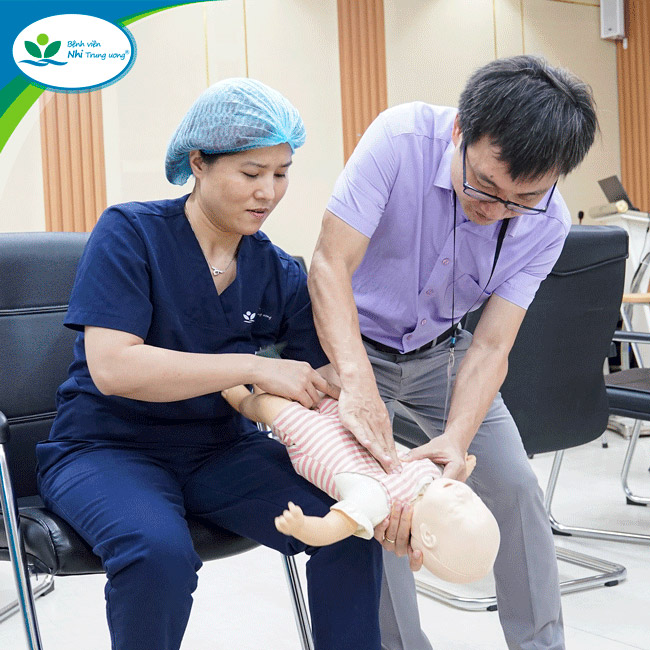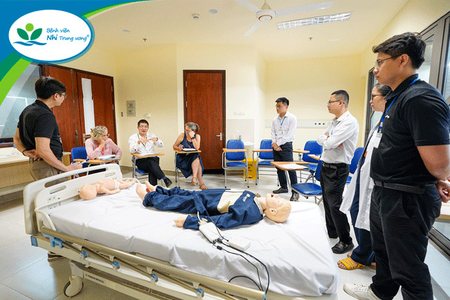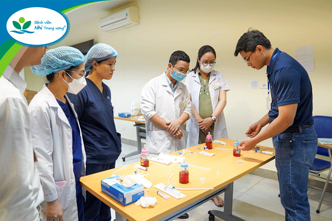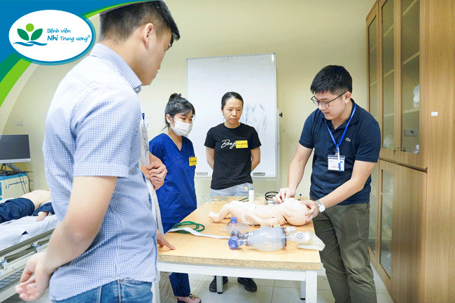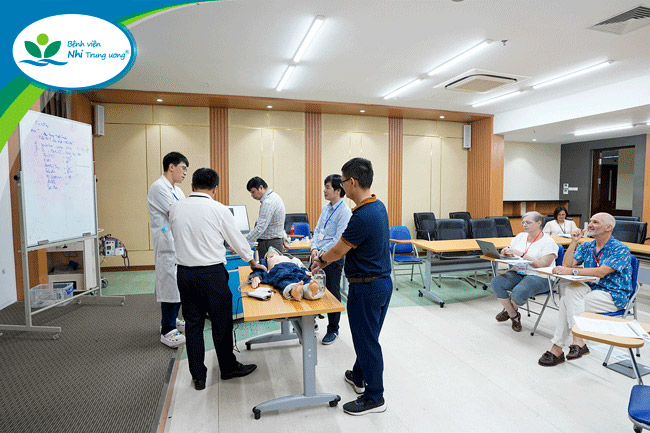 Đặc biệt, các bài tập tình huống minh họa trong khóa học đã góp phần giải quyết những vấn đề cụ thể mà học viên gặp phải trong quá trình giảng dạy, giúp học viên hiểu cách truyền đạt và hướng dẫn thực hành khi áp dụng vào đào tạo cấp cứu trẻ em cho nhân viên y tế. Đồng thời, việc thực hành trực tiếp trên mô hình cũng giúp học viên tiếp nhận kiến thức một cách trực quan, sinh động hơn.